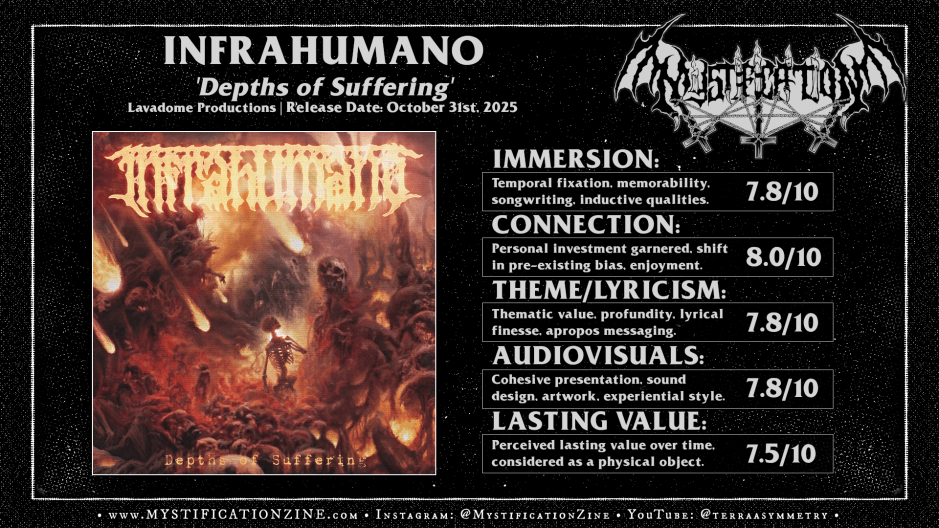 In thorough examination of their ongoing pursuit of groove-driven damage applied to canonical death metal fire Vigo, Spain-based quartet INFRAHUMANO resemble the impact of a siege engine per their sophomore full-length album. Though they’d ‘ready breached that particular wall on their previous record here on ‘Depths of Suffering‘ they’ve purposed said accumulated personage into refined performance and render, tightening their mechanism into repeatable yet easy-flowing violence per this second pass. While it isn’t built to be all that catchy or memorable there is some palpable rush to be gleaned from their weave between volcanic bellows and groove-heavy volley.