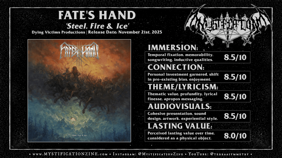 Fate’s Hand formed as a quartet circa 2019 intending a heavy metal result via songcraft via guitarist/bassist Gjöll (Mongrel’s Cross, Consummation) and vocals from Denimal (StarGazer, Intellect Devourer, et al.) alongside a rhythm section that’d stuck around for their self-titled EP (‘Fate’s Hand‘, 2021). When I reviewed it I’d praised the personality available to those four songs describing it as: “…a bard’s lungful of adventure, glory, and rousing upward-striking heavy metal guitar music that tells its tale via intensely composed works and roar-of-the-crowd worthy performances.” while suggesting the obviate relation between certain types of extreme metal and epic heavy/power metal. While many folks heard everything from Bathory to Queensrÿche (?) I’d walked away from that EP expecting something kinda pre-’88 Fates Warning or early 90’s Running Wild in stature. After spending time with this new LP (+ staring at the cover art for a bit) the Quorthonian epic heavy metal fumes are impossible to deny here, particularly on the first and last songs.