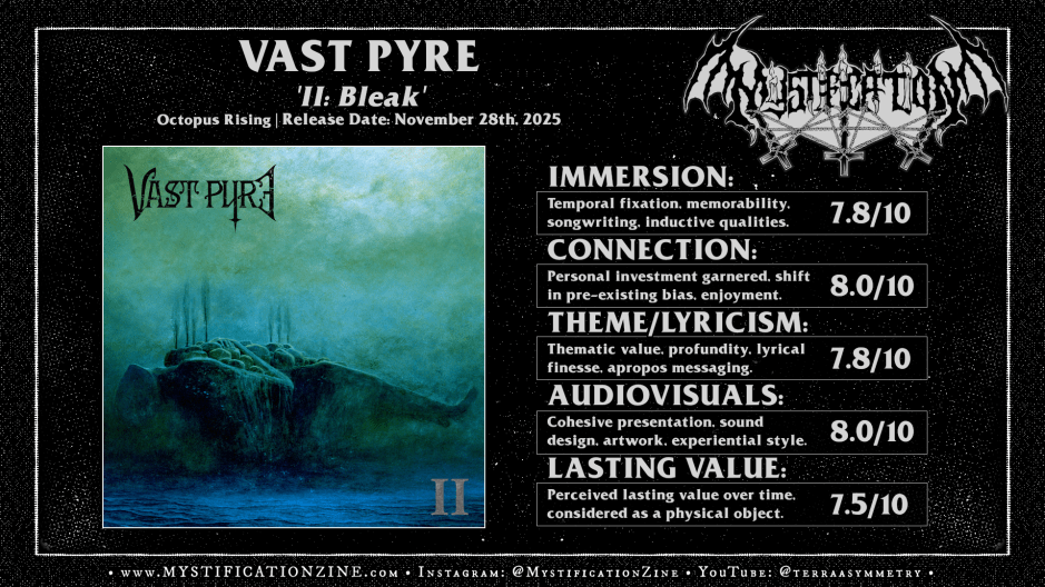 Vast Pyre formed as a duo in late 2021 who’d suggest their goals align with doom metal enforcing both minimalism and menace in its craft. They’d opted for a full-length out the gates via ‘Vast Pyre‘ (2024) which presented as a stretch of ~ten minute droning sludge-toned psychedelic doom metal pieces awash in their own drowned and miserable search through both tradition and groaning abstraction. Raw, menacing snarls and clean-yet-despairing narration from Ch. Wallstein, a former live drummer for Eremit, lent their debut compelling enough character in the realm of stoner/sludge affected doom. It were a buzzing rocket fueled by dark matter, careening toward an unknown target, building tension as each piece droned and/or jammed past sans conclusory statement. The dire tone of ‘Vast Pyre‘ was its strength while it wasn’t necessarily memorable tune-for-tune, with most pieces dragging along at similar pace and ranting into the void throughout. I’d enjoyed the sheer despair of it all but wanted more in the way of either the riff, or their dark psychedelic abstraction. This new album delivers both, more-or-less.