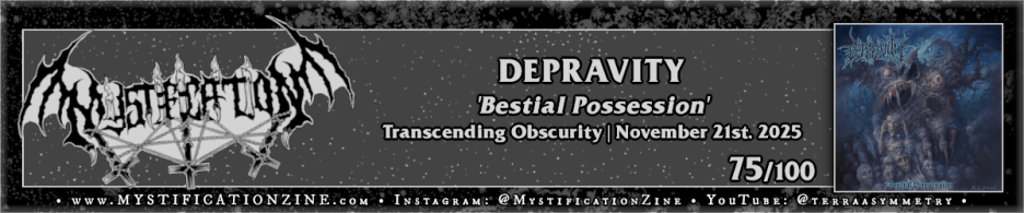 Perth, Australia-based death metal quintet DEPRAVITY return for a third full-length album in ‘Bestial Possession‘ and for the first time they pull at least one or two punches. That is to say that their work here is still belligerent, a product of peak Nile and Behemoth indebted “blackened” death excess in the mid-2000’s when any sort of groove or tech-death abraded phrasing is concerned, but they take a breath here and there to break things up (re: “Call to the Fallen”). If you are a fan of Polish death metal’s heyday in the post-millennium I think you’re particularly going to appreciate where this record goes but they’re into moshable brutal death metal in any sense (“Awful Mangulation”) and this starts to override some of the stuff we’ve heard a million times otherwise. More shredding leads, more atmosphere in general and the same spine-whipping pace you’d expect make for brutal scrub through, it’ll have some instant appeal in that sense. I’d felt like the cranked to eleven modus eventually overtakes all, quieting the more nuanced movement in between rallying, but per this type of death metal it very well should. Check out closer “Catastrophic Contagion” if nothing else.