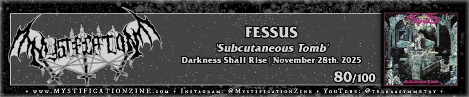 ‘Subcutaneous Tomb‘ is the debut full-length album from Vienna, Austria-based death metal band FESSUS and you might recognize their name if you followed any of my covers of Molten Chains in the years past as guitarist/vocalist Brenton Weir also fronts this band. Their style is completely different, though, as mid-paced ‘old school’ death metal aiming for the arguable peak of the sub-genre circa 1989-1992, retaining some thrash and grindcore edged shapes in their arsenal. If you’re familiar with Weir‘s compositional hand, especially when it comes to lining up an entertaining thread of riff-after-riff you’ll find some recognizable movement but given to a slower pace. The effect is exploratory in the sense that each song’s structure is fraught with tangents a la Creepmime or the first D.V.C. album which serve to redirect the ear moment-by-moment while taking on some of the ‘Necroticism…‘-era precision of the suggested era. While the whole deal is prone to awkward rants and the momentum feels both shaky and sluggish at times this only adds to the anxious, pure underground grime of the full listen.