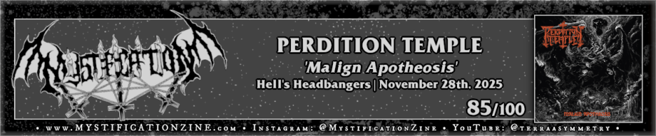 Wasn’t going to cover this one because the album art looked like a loosely traced over AI-generated composition but I am too big a fan of Palubicki and co.’s work to overlook a new PERDITION TEMPLE record. He’s also got an incredible debut record from Malefic Throne releasing the same day, so, check that out too. ‘Malign Apotheosis‘ is exactly what you’re looking for as a longtime fan of these folks work: An unflinching cutting hand still drives their thrashing blackened death attack to mayhemic speed and feats of insane rhythmic violence. This time around I’d found certain songs more clearly injected some classic thrash-era movement (“Resurrect Damnation”) and/or death/thrashing ammo dumps which to me recalled ‘Retribution‘, or, a general Floridian death metal cut. Outside of maybe the return of Chaos Inception… I think Palubicki delivers some of the best riffs of 2025 (re: “Agony Unto Revelation”, “Purging Conflagration”) between this record and ‘The Conquering Darkness‘.