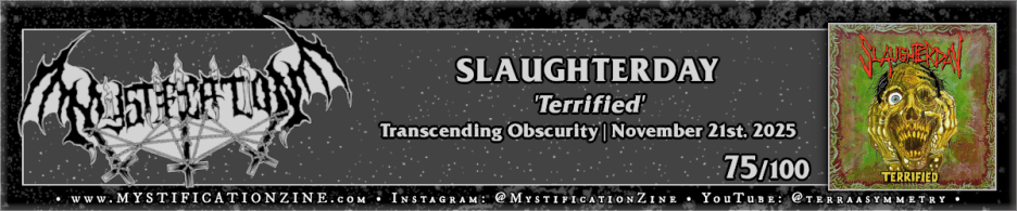 German death metal duo SLAUGHTERDAY return for a fairly short EP here with ‘Terrified‘, their own take on mid-to-late 80’s grindcore in tribute to those particular origins. The way this pans out is exactly as you’d expect from a band named after an Autopsy song, swimming in muddy gore as they pull from primitive thrashing punk-influenced death metal. Opener “Ashes of the Innocent” is set up front for good reason, this is probably where they get it most “right” from my point of view whereas they’re far too heavy handed with some of the transitional riffcraft on “Fleshtorn Future” right afterwards. Otherwise the two ~2 minute songs, the title track (“Terrified”) and “Chained to Oblivion” bring a battery of creeping-fast energy into the fray, the type of song you’d want to hear on one of their albums. Overall a worthy 7″, a cool idea, and some of their best stuff beyond the 2010’s for my own taste.
