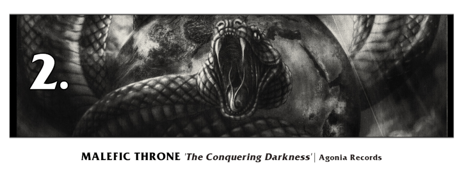 “In an act of cruelest havoc upon the firmament above a strike of vengeful annihilation rains down unto fiery cataclysm below as Florida-based death metal trio MALEFIC THRONE dominate the skies with an imposing, fire-breathing debut full-length album. Though it comes calling from the light-flooded mouth of the shining one ‘The Conquering Darkness‘ is yet unreasonably physical in achieving its spectacularly ruthless style, a timeless form of death metal accelerated to peak impact and riff-count while calling down unreal blasphemy. While I’ll pay no mind to the bunk-ass idea of a “supergroup” mattering beyond material… in this case both the familiarity between and infamy of the folks involved in this work weigh heavily upon the sublimity of its outcome, achieving one of the most wrathful releases of the year by way of seeming effortless mastery.“