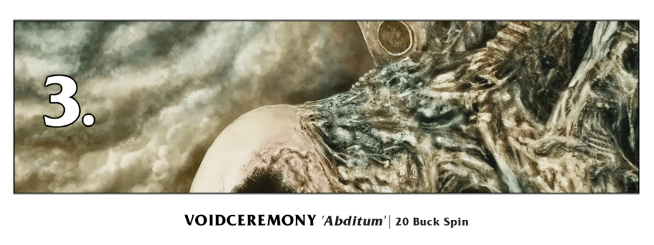 “Intending to document their skull-first journey in access of the corrupted Seelengrund as locus Ramon, California-based progressive death metal quartet VOIDCEREMONY return for an altogether refined and ever-searching third full-length album. Leveraging shoulder-to-shoulder density within increasing brevity ‘Abditum‘ may very well take some time to bloom in brain as its myriad call for dilation and constriction of extra-scalar forms is a thrill but an abruptly demanding event all the same. Here they’ve righted their ship in some sense, taken command of its wandering soul at any rate, accessing both classicist handling and freshly inventive interplay which’ll take keener-eared musos some time to sort in mind while still bossing their own channel of warped shred.“