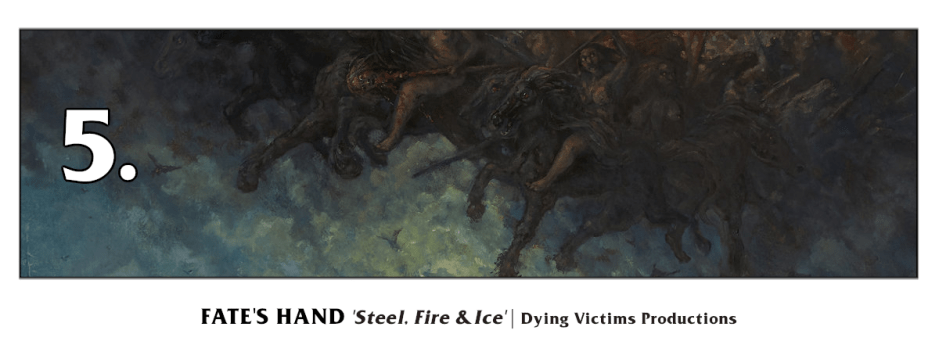 “Sounding the great horn, ensorceling their spell of death upon iron, and calling down the devourer’s jaw Brisbane, Australia-based epic heavy metal duo FATE’S HAND engrave the earth with well-tempered blades on this inspired debut full-length album. With strong personage carried up front and additional melodic acumen presented throughout ‘Steel, Fire & Ice‘ strikes a chord most resonant with 80’s epic heavy/power metal interest while bringing well above-average riffcraft to the fray. Although this is a debut the end result is all-pro, not only in terms of render and performance but with a clear identity forged and worthy, memorable songs in hand.“
