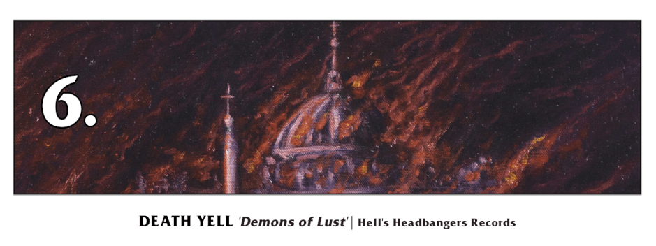 “Returned from the depths as creatures of vengeful darkness Santiago, Chile-based black/death metal quintet DEATH YELL are arisen once more through pandemonic rites to reign with terror as their nigh four decade long history arrives upon an admirable sophomore full-length album. ‘Demons of Lust‘ does not attempt recreate the conditions of the late 80’s that’d birthed their craft so much as it recognizes the timeless furor and erratic function that’d made South American extreme metal such a storied and influential force in their heyday. As such we get an update to their maniac signature which still bears the thrilling daemonic spiritus of the old ways without the too-common feeling of “half right” takes on ancient forms, perturbed by modernity or cleansed of any essential grit.“