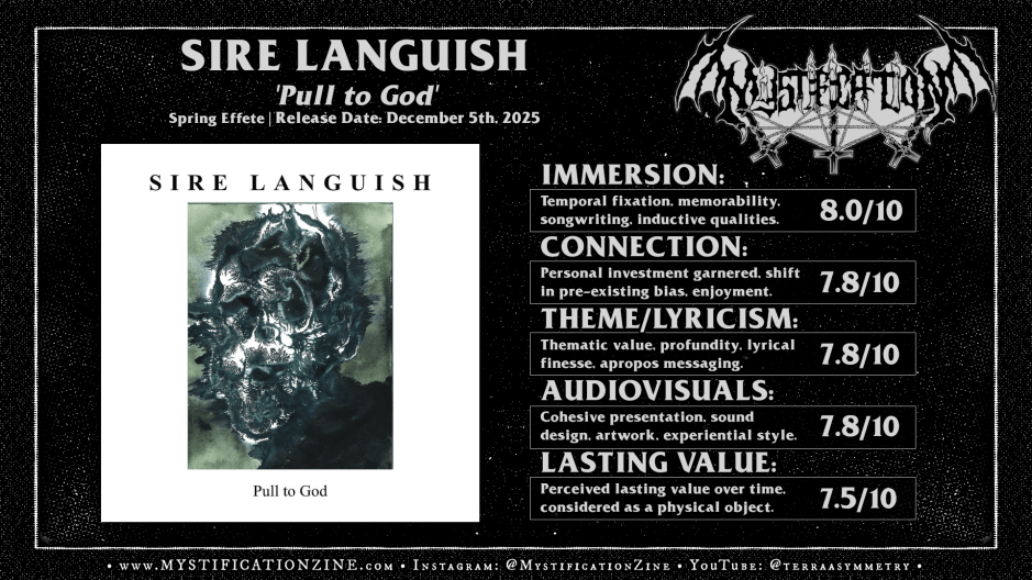 Perplexed in a state of permanent despondence New York, New York-based post-industrial metal solo act SIRE LANGUISH generate a nightmarish mechanism for personal enlightenment within the course of this self-built debut EP. ‘Pull to God‘ is an omen as much as it is an achievement in self-hypnosis, a solo record which flexes a long-developed personage while speaking from dread-filled throat as the artist brings their own genesis to the rigidity of early industrial metal and post-punk dissociation. While some methods are long ingrained per their naturally arrived-upon flow others are exploratory and even surprisingly extreme per the given parameters making for a hypnotic but not-so sedate experience.
