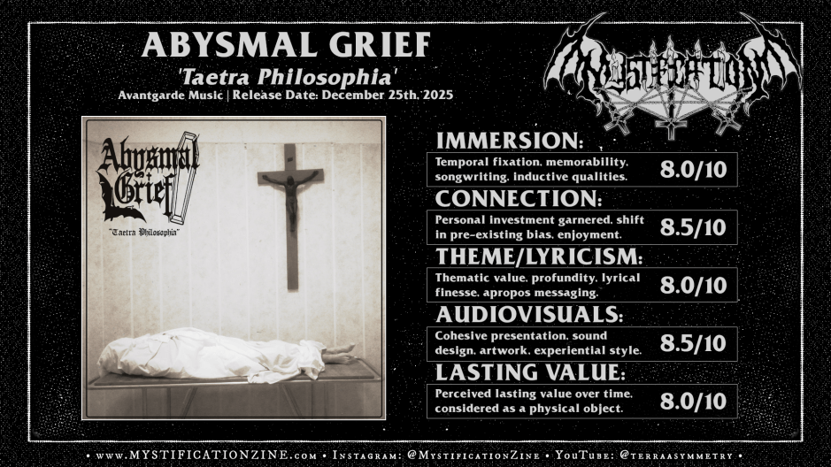 While I emphasize the focused, steadied hand of their creation over the years as a feat centered on the subject of mortality, death and its inevitable summon Abysmal Grief‘s music is both reactive to their environs as well as evolving within unhindered vision. From droning, slow-slugged stuff at the peaking Reverend Bizarre-adjacent (in timeline, not style) years to jogging keys-assisted tuneful reap their capabilities have scaled with experience rather than ambitions beyond the real thing. The band’s most recent LP ‘Funeral Cult of Personality‘ (2021) reflected a different sort of unrest, it was not quite a pandemic album in subject but one that was marked by a level of focus made possible per band leader/guitarist and drummer Regen Graves isolating due to burnt attitudes in their circle and an uncertain future for the band. It was interesting as a fan because the material itself was changed, darker from a different stance, the sort of re-angled gloom one’d want after the adventurous ‘Blasphema Secta‘ (2018) before it. There was some wonder where the reactionary affect of the band might manifest within ‘Taetra Philosophia‘, an album which doesn’t escape these connections made between religion, superstition and the fools made by each.