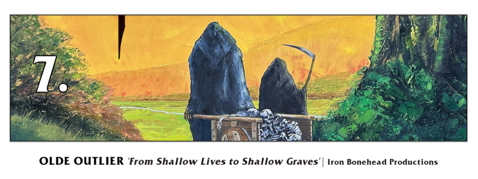 Olde Outlier probably aren’t the sort of band one could coherently describe in one succinct sentence, their work is by design some manner of blackened death metal yet it conjures an extreme form of heavy metal at a mid-pace, a sort of ‘epic’ or at least dramatic hand applied. It wasn’t that I’d found myself describing a different band within each longer-form piece applied during review but rather than ‘From Shallow Lives to Shallow Graves‘ twists upon itself, bends its extreme metal timbre into both tripped-out rants and soldiering tanklike movements often in unpredictive conclusion. All of this comes without rapt urgency and instead unfurls into engrossing result. It won’t be the one to truly brutalize the ear with any sort of catchy worm nor any sort of hammer but should catch the ear of patient, thoughtful skulls who still have a psychic connection to heavy metal’s traditions.