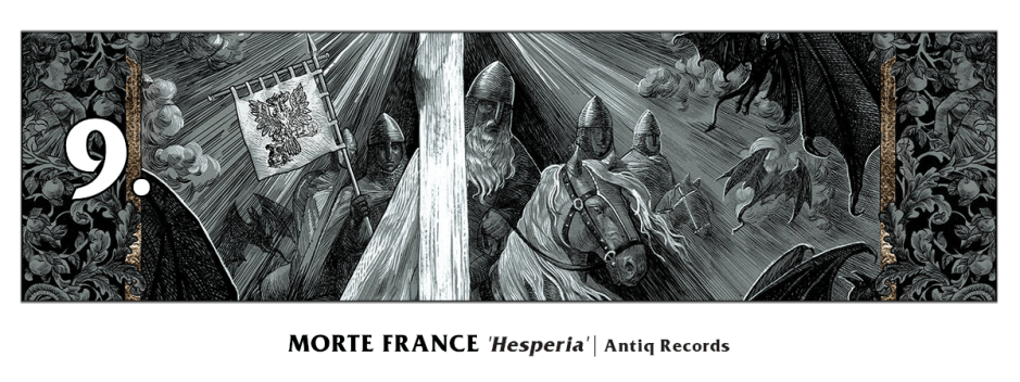 Pagan/epic black metal troupe MORTE FRANCE comes from founder Kval who’d aimed for ‘Hesperia‘ to resonate with European heritage and history speaking to both Pagan and Christian symbolism and heroism alike as the band’s range broadens beyond their debut LP. Parts of this album hit like an old Hate Forest or Belenos record alongside their own ‘epic’ focus where various vocal styles and lead guitar melodies create peaking moments. You can feel the inspiration for this album when sitting with it despite its uneven pace and broad themes, something a bit less introverted than one’d expect from this arena of European black metal.
