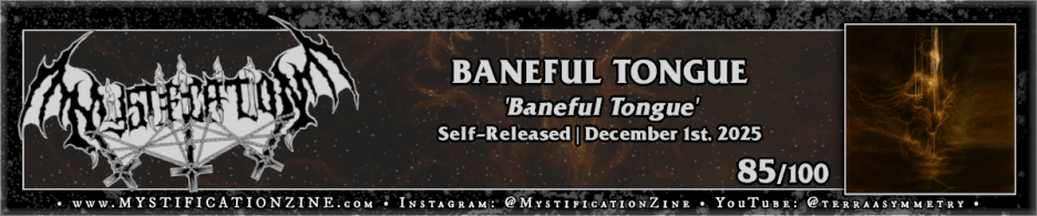 Though his efforts in brilliant heavy psych/doom band Dunbarrow are probably best known Haugesund, Norway-based artist S.B.E.‘s solo work in Nemesis and now BANEFUL TONGUE have focused on obscure forms of black metal with the former carrying a dissonant, erratic cause and the latter breaching black/death metal inspired by groups like Black Curse, Howls of Ebb and Teitanblood. ‘Baneful Tongue‘ is essentially built upon an exploration of black metal riffcraft, pulling various rants from a specific pocket and then elaborating upon their distinction with typically unique feats of his rhythm section. You’ll get what I mean when “Mind of Torment” (see also: “Bells of Falsehood”) begins to weave in its almost Virus-esque worming swagger, a jogging black metal roll which wriggles and agitates as it hurls downward. Although not every song here feels so unified in its directional accost most persist within blast-paced and wrathful bent that keeps the ear trailing along via a snapping rhythm guitar tone and the occasional thrum of the bass out of line. This is the sort of album that gains in value with familiarity in the sense that its violent energy and bruiser pace eventually numb into mind and the nuance available to each track, through respite or sea-change, becomes its repeatable knack. Production values are particularly good here, raw but infernally present where I’d particularly appreciated the space given the bass guitar within slower, meandering movements (“Divine Dissonance”).