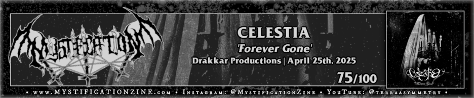 My experience with French black metal act CELESTIA has been one of grotesque romanticism, works which are defined by retched-aloud and bemoaning vocals beside a post-LLN pathos, a defiance of performative values which hasn’t persisted without evolution since the mid-90’s. Often described as “gothic” and raw over the course of (now) five albums their creations on this latest post-reformation release resemble haunting apparition in surprising clarity. When I suggest clarity I do not mean to solely discuss production values, these pieces aren’t so polished that they reflect light, but rather streams of thought which form into repeatable shapes which rise-and-fall within their dramatic readings. The dreariness of their work is best exemplified between a pair of tracks mid-album (“Departure” and “La Parfum de la Nuit”) which gallop, glower and purge in a way that still represents their body of work with sense.