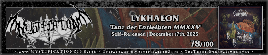 Zürich, Switzerland-based troupe LYKHAEON were initially a quartet from 2013-2015 and in that space of time they’d produced their debut LP, ‘Tanz de Entleibten‘, at a pivotal point in the Jünger Tumilon (previously Helvetic Underground Committee) timeline in terms of creative output though an early-days venture with regard to mixing/mastering. This is the general pitch for their remixed, remastered and partially re-arranged version of said debut ‘Tanz der Entleibten MMXXV‘ which not only celebrates the tenth anniversary of the record but juices it up to their current standards. Most of us discovered this project via ‘Opprobrium‘ (2021) so it is interesting to hear both the primal beginnings of that meditation alongside souped-up production values, a treatment which yet preserves the dissonant, experimental and feral atmospheric hurl of their work circa 2015. While I figure I could delve into what makes this unpredictive, varietally scorched and oft harried work special I’d almost rather offer a blanket endorsement for literally everything these folks create as a collective, all is crafted and curated with a serious hand and some manner of meaning (esoteric or otherwise) which enriches the mind when examined by a keen eye and ear. Check out Arkhaaik and Arrows, too.