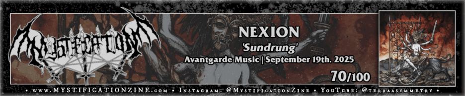 Reykjavík, Iceland-based quintet NEXION carry some of the same visual taste and sonic sensibilities as the aforementioned Luctus but these folks bring dramatic lushness, hymnal melodic black metal exaggerations to their sound rather than rapt, technical aggression or any tangible death metal features. Though their production values are a shade too polished for my own taste there is a high standard achieved here for the general black/death metal audience and the result is impactful, palpably frothing with aggression because of this general loudness applied. For a sophomore full-length album ‘Sundrung‘ is snarling but unhurried, flows but doesn’t always seamlessly connect one thought to the next, yet the overall tone of the experience is all too uniform. Though I appreciate this type of work it doesn’t quite reach the high benchmark left by albums like ‘Revelations of the Red Sword‘, nor does it achieve either melodic or riff-centric appeal and ends up a loud but middling trance.