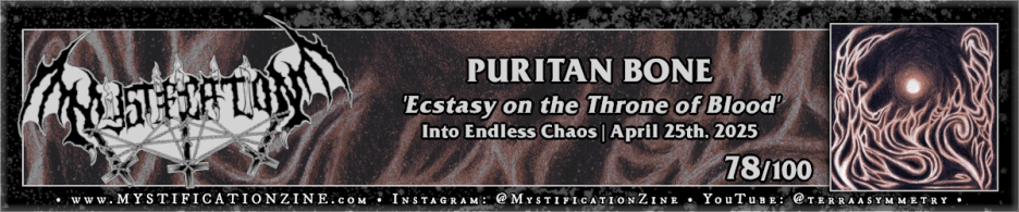 Defying the hard-cut shapes of obsessive technique in favor of long-arc’d threads of slow-burning fume Nijmegen, Netherlands-based atmospheric black metal duo PURITAN BONE offer an experience of patiently scarring strum via their debut full-length album ‘Ecstasy on the Frontier of Blood‘. There are feral voices and even some folken ebb to these longer, droning pieces but in general the ear will swap between carefully climbing strands of distant riffcraft and treading water in the dark. A more recent concoct from T. (Furia, Nusquama) and Lethargor of Nacior Udun these songs reflect both the evolution of scenery and their own inner-channeled exploration where repetitious and easily pouring atmospheric black metal find a flow-state and wisely choose to ride the waves ’til sated. Though I’d found this release maddening in its slow-waltzing, surprisingly un-gilded forms to start it’d eventually grow on me within a disconnected state of mind. It isn’t the type of album one’d get hyped out their skull for but rather one that slowly peels away the impatient mind’s defenses and (in my case) captivates.