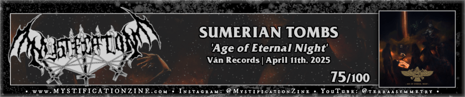 For many black metal fans the viability of any (non-contra) cultural contribution from the sub-genre centers around its treatment of both history and mythology, a natural generational result beyond 70’s progressive/heavy rock’s contributions to storytelling and the first wave… and I point this out for the sake of bands like Cologne, Germany-based quartet SUMERIAN TOMBS who offer their own fantastical “epic vampyric” narrative within the context of Sumerian mythos, where second wave black metal inspired fare regales all with the summon of ancient evil. While the superficial hordes’ve compared these folks’ efforts to basically anything with similar themes ‘Age of Eternal Night‘ does not reflect the actual music or storytelling of bands like Melechesh but rather has more in common with moderne melodic black metal and its adjacency to post-black atmospheric exaggerations, this is not an Immortal or Enslaved record in its unfurl but should carry brough appeal in that direction. I’d found so much of this effort focused on grandeur, its blustering yet delicately strung waves of despondent-yet-majestic movement that only just a few songs found any practical impact (re: “Age of Eternal Night”, “Epitaph in Blood”, “Edimmu Rising”) while others trailed on for ~6-8 minutes of cinematic sprawl and revenant gloom. The greater effect is immersive to no end but when it comes to pecking their work down to the last riff it’d proven more of a theatric experience than the rhythmic force I’d been anticipating after their previous LP.