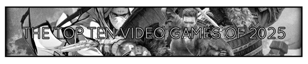 THE TOP TEN VIDEO GAMES… of MMXXV represent a brief respite from the mediocrity of the artform, a handful of substantive, or fun, experiences within an ocean of exploitative horseshit. Before we get to the best, the Worst Disappointments of the year alongside a few unfinished games should account for stuff I’d played but didn’t end up ranking. Otherwise the Top Ten list itself only features games I’ve completed at least once and doesn’t include multi-player only or massively online games with one exception. The one game I haven’t completed yet that I’d liked this year was The Séance of Blake Manor.