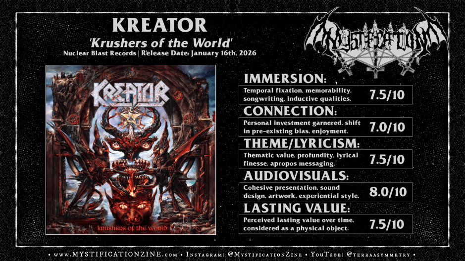 As one of very few long-sustained idealist factions left within the pantheon of the original thrash metal movement Essen, Germany-borne quartet KREATOR persist in mind as key representatives in approach of this fairly accessible sixteenth full-length album. Despite the increasingly approachable gloss given to their work ‘Krushers of the World‘ yet manages to inspire thanks to its balance of anthemic rouse and tuneful-yet-ripping signature. Seated, wide-eyed and presented with a toe squarely set within 2026 their work continues to seek its next statement, a new variant or different path forward and that’ll hit for better or worse depending on what sort of fan you are.