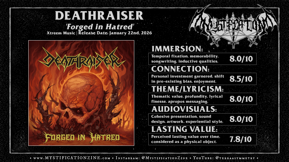Time has only made Deathraiser a more formidable band and this album smokes front to back as a result of their unified vision. Without throwing any sort of wrench or misplay onto the killing field ‘Forged in Hatred‘ is clearly made for the ‘old school’ thrash metal lifer looking for this brand of violence and in this sense it delivers the real thing. More important to longtime fans the album retains the grave reactionary character the band’d concieved two decades ago and makes sense when set aside a copy of ‘Violent Aggression‘ so many years later. Of course I could go on about how much the rhythm section improved in the meantime, point out some brilliant bass guitar work throughout, and name-drop several more elite bands but the folks who’ll pay this one mind already understand where these folks are coming from and only just want more. Count me among the hordes as I’d found myself returning to this album for the steadily intensifying, riff-obsessed tunneling found within. A high recommendation.