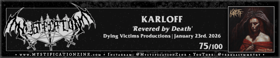 Oldenburg, Germany-based trio KARLOFF is a project from Tom Horrified of Hallucinate and Graveyard Ghoul which upon first impression seemed to revolve around a style of punkish black/heavy metal not-so distant in tone from labelmates Barbarian via a brusque Celtic Frost-esque movement in hand. For this second album, ‘Revered by Death‘, the band take quite a few more liberties with their sound as evidenced by the strange choice of a ~4 minute dark ambient instrumental set mid-album (“On Weathered Altar”) and generally barked and rocking step, almost resembling the shouted and irrational grooves of early 90’s post-hardcore/noise rock at times (“Crown Cult Fate”, “When The Flames Devour You All”.) Not sure what to think of the full listen here in terms of easy categorization but they are either onto something original here or haven’t quite realized the core alchemical formula conceived.