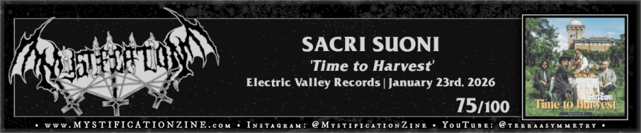 Milan, Italy-based psychedelic doom/sludge metal quartet SACRI SUONI return for another voiceless monolithic clobber with ‘Time to Harvest‘, a second and even more solidifying argument for instrumental doom metal writ as purely imposing presence. Stoney, surrealistic production values and groaning guitar tones do a lot of the heavy lifting here in terms of bringing sludge/post-metal cinema into the oaken horror of stoner doom metal but there’ll be no escaping the feeling of background music to well-worn ears sans any vocal contributions. Use of electric organ (“Dissolve to Reunite in Varanasi”) and extended drifts into ambiance (see: second half of “Soothe”) bring flashes of brilliance in the suggested colliding realms. Without any notable central voicing beyond a handful of riffs the spectacle generated sums to a moderately repeatable session on my part.