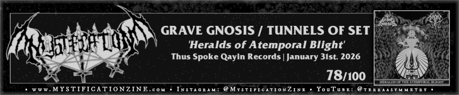 ‘Heralds of the Atemporal Blight‘ is a split album in feature of two notable Floridian bands including St. Petersburg-based atmospheric black metal quintet GRAVE GNOSIS and Tampa-based melodic black metal trio TUNNELS OF SET both of whom bring esoteric occult spirituality into their personage. The former has been around since the late 2000’s having released five full-lengths in the process of developing a cavernous, nigh hallucinatory effect oft prone to longer form pieces just as we find here via the two droning ~10.5 minute songs which serve as their half of the action. The latter’s style reminds me of the type of black/death metal that’d been heavily featured in the popular French scene in the late 2000’s/early 2010’s as a caustic yet melodious hand presses at the skull with high intensity throughout each of their three works. Though I wasn’t familiar with either band heading into this one I’d found their very different styles were complimentarily immersive, fixated on the sinister spells being cast as purpose and each generally stylized in their own performances. For my own taste Grave Gnosis edges closer to my own taste but again this pairing makes sense and the juxtaposition of styles avoids any dips in the action.