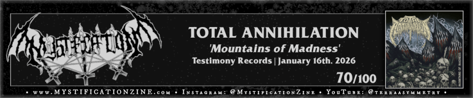 Basel, Switzerland-based crew TOTAL ANNIHILATION hit their second decade milestone in 2026 with album number four, ‘Mountains of Madness‘, another churn through death, thrash and metallic hardcore/groove inspired aggression. Often compared to the post-melodeath era of revivalist death/thrash metal (re: Deathchain, Dew-Scented, et al.) in the past this time around they’ve promised more aggression and intensity which is generally served. To me their work occasionally recalls the grey area where late 80’s/early 90’s death and thrash metal bands transitioned to groove metal, at least the few who’d simplified things without losing their rhythmic volatility but you’ll otherwise find a modern ideation of death/thrash metal here. Riffcraft here is consistent but nothing unheard-of, a few pieces hit like Power Trip and others might fit on a Defleshed album, none of ’em bad but also lacking any one standout showing of force. A well-made record overall, some less thoughtful or stifled pieces crop up toward the end but it’ll prove nothing to sneer at for a spin or two.