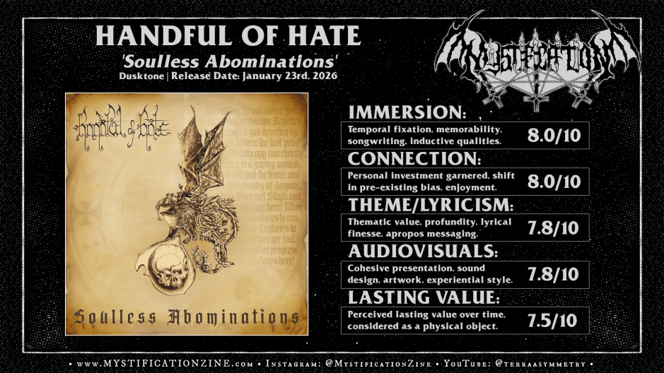 In all fairness I probably would’ve reviewed Handful of Hate with the same level of praise back in 1997 as I am today and for similar reasons, they’ve held onto some of that spark despite having spent a couple of decades leaning in a severe and brutal direction which is yet reflected here about sixty percent of the time. That said ‘Soulless Abominations‘ stands out today in 2026 not only for their effortless connection with the past via atmospheric and melodic extrusion but via the vibrancy of their attack, keeping their vison of black metal ruthless and confrontational even within their most beauteous arc. Straightforward as some of this work is that should prove a great deal of its appeal for folks looking for something authentic yet unwilling to pander to the fun of never-was revisionism today. A moderately high recommendation.