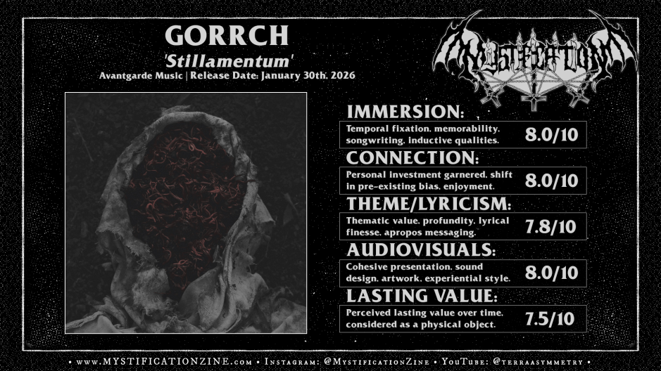 Any fan of dissonant guitar work and moderately technical avant-garde black metal should appreciate this extension of Gorrch‘s 2020 breakthrough as the end result is unique in voice if not repetitious in its heated thrum. As a work of psychic tension, guitar thrashing clangor and strangely monastic hum there is some great mind-altering effect when sitting with ‘Stillamentum‘ for repeated listens. Despite the overall familiarity of their greater components this second album from the band manages to stick in mind for the gestural nuance and finer details afforded its whipped-at modus. A moderately high recommendation.