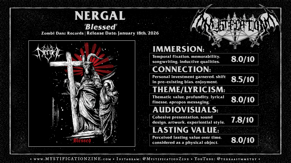 In ungainly, wrathful return to their shadowed past Piraeus, Greece-based black metal trio NERGAL speak directly to the raw, unpretentious and unfettered gloria they’d birthed from on this inspired fifth full-length album. Bolstered by new yet well-proven cultists ‘Blessed‘ reaches back to the authentic struggle of the early 90’s and explodes that ideation into six extended pieces, each sporting a hypnotic diabolism which fandom of Hellenic black metal style will instantly appreciate. If you’d not paid mind to their last twenty years of output this work, a high point among many great acts, should provide reason enough to explore their underappreciated legacy.