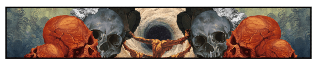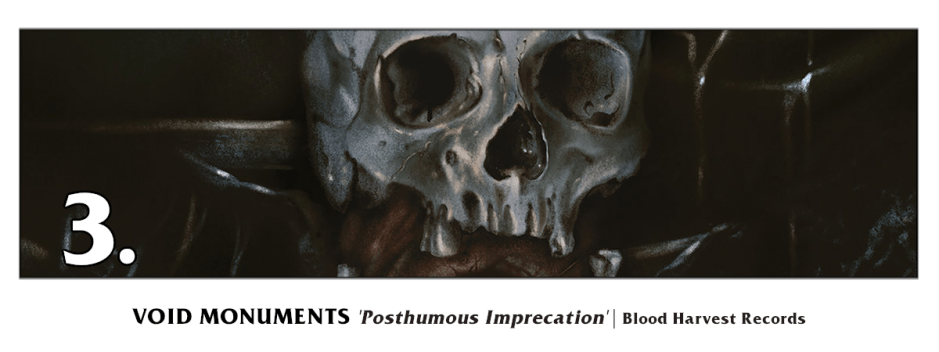 “Hiking all shoulders and muscling downward in their efforts to crack apart the jaw of the deathshead Saint Petersburg, Russia-based death metal band VOID MONUMENTS allow for louder unhinged mockery of the martyr’s passion as they arrive upon their debut full-length with notable readiness. That is to say that ‘Posthumous Imprecation‘ is an exceptional study of 90’s death metal and its holistic generational evolve where the work shows, allowing patiently cut forms to serve deliberate destructive acts where the riff is key feature but only becomes truly illuminated by the atmospheric friction granted between performance and render. Though the homogeny of the ‘old school’ death metal zeitgeist distilled into simplified formae entertains multitudes of artists today here their exception grants this severe character, a trampling foment of a death metal album which manages personae and ouevre in service to the (death metal apropos) song rather than quick-shot moshable vignette.“