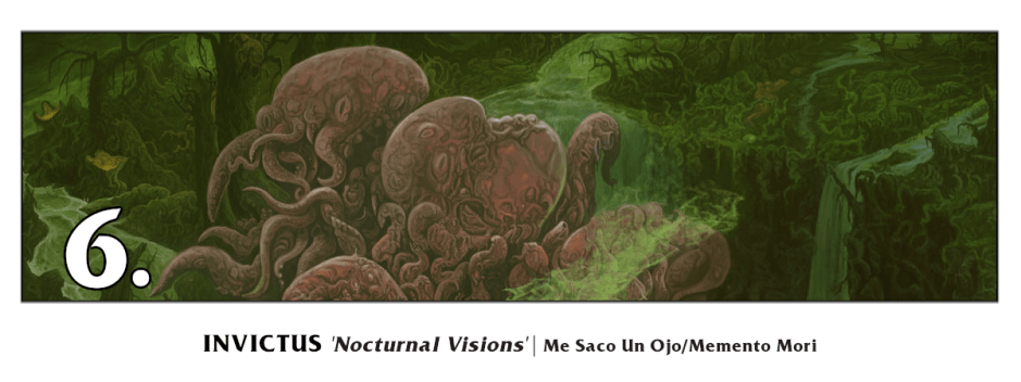 “Rather than continue to tunnel inwards in pursuit of appropriately eldritch rhythmus Nagano, Japan-based death metal trio INVICTUS have instead chosen to expand outward, blooming their sharply cut and percussive form of classicist fare into a well-rounded sophomore full-length album experience. Though said experience is built from familiar parameters, throttled as often as it is weighted down by ten tons of groove, ‘Nocturnal Visions‘ yet appears as a product of holistic evolutionary sight beyond plainest self-revisionism, a feat which expands and blankets atop past development. The result is believably spawned from a passion for the peaking designs of death metal in the early-to-mid 90’s yet tempered for the last couple of decades of all-access tradition, a feat which holds one foot in better days and another in the grime-polished dead eyed stare of the present.“