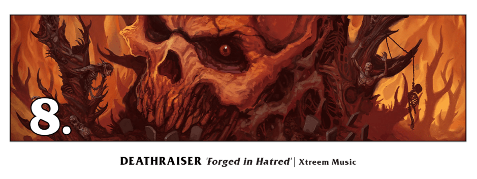 “Idiocratic greed sustained through the chaos created by brutally mediocre men and their regimes the world over serves as the exact right catalyst for Leopoldina, Brazil-based thrash metal quartet DEATHRAISER to return with a sophomore full-length album nearly a decade and a half beyond their last act of violent aggression. Once more piling into the fray for the sake of their righteous, brutal command of the riff ‘Forged in Hatred‘ reflects a combination of sub-genre obsessed classicism and timely reactivity as these folks grind through ~34 minutes of sublimely chainsawed-out thrash metal built on the still-reeking corpse of the late 80’s. No gimmickry, no out of touch politico, and no real melodic intent serve to interrupt their corrosive thread here making this a real head-down ripper worth diving into if so inclined.“