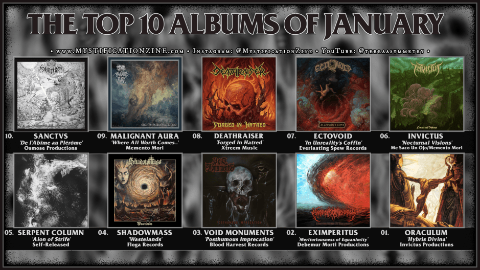 I. This month on MystificationZine.com was generally excellent, entertaining enough that for the first time in several years I could’ve gotten away with a Top 15 and felt good about every entry. While there were brilliant releases from legends like Kreator and The Ruins of Beverast… even a final LP from friggin’ Megadeth was kinda ok, but I’ve chosen to focus on bands/releases which’d impress even without a too-familiar name up front. For the sake of coving a broader range of metal sub-genre (sorry, no doom this month) I’ve left out runners-up records from Handful of Hate, Nergal, and Gorrch each representing their own unique perspective/niche of black metal.