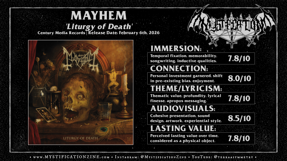 Inciting compulsory physical supplication through erratic recitations in service to death’s worship Oslo, Norway-based black metal quintet MAYHEM generate offerings of obscene truth, a liberating ritual of communal desacralization per this characteristic seventh full-length album. Any band that’d been as germinal, initially controversial, and long-standing as these fellowes will inevitably be seen as caricature decades on but ‘Liturgy of Death‘ instead suggests the benefits of a stability of authorship are real as they continue to develop their own modern iteration. The end result is familiar in the best sense, approachable work easily recognizable as the band’s current evolutionary voice, though fans of their middle-era’s challenging/caustic muse may not find any grand leap beyond more recent work(s).
