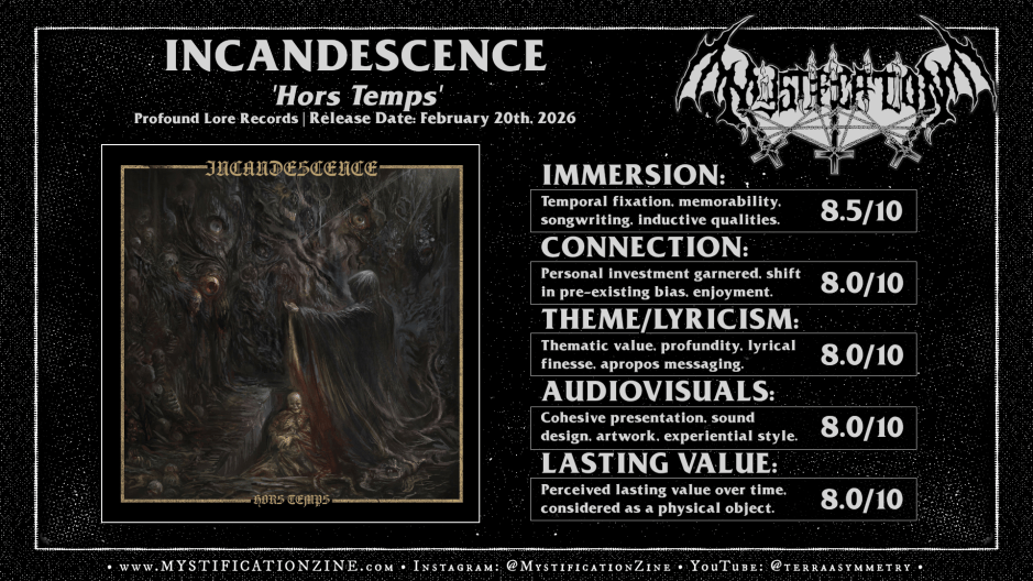 The reaper’s scythe sits frozen aback, halted mid-swing as the hollowed black eyes of Death stare dazzled, thrilled to stars by the infinite quietude sure to follow the end of his work. Left to sludge about between makeshift coffin walls ’til battered enough to seep back to soil this fifth full-length album from Longueuil, Québec-based black metal duo INCANDESCENCE once again embraces nihil on the trickle-down. Here the grave has been dug, (most) every last eye is shut and time returns to its work of cessation sans observation as ‘Hors Temps‘ announces the hourglass’ finale with storms which embody both melancholic tragedia and latent furor. Through the myriad guile of Québécois black metal-adjacent plume the endtyme is parsed amidst seeming unfinished business, a wrestling apart of sentimental and beauteous strands from imaginative bursts of destruction ’til the rift between is stretched into ungainly flexion of forms.