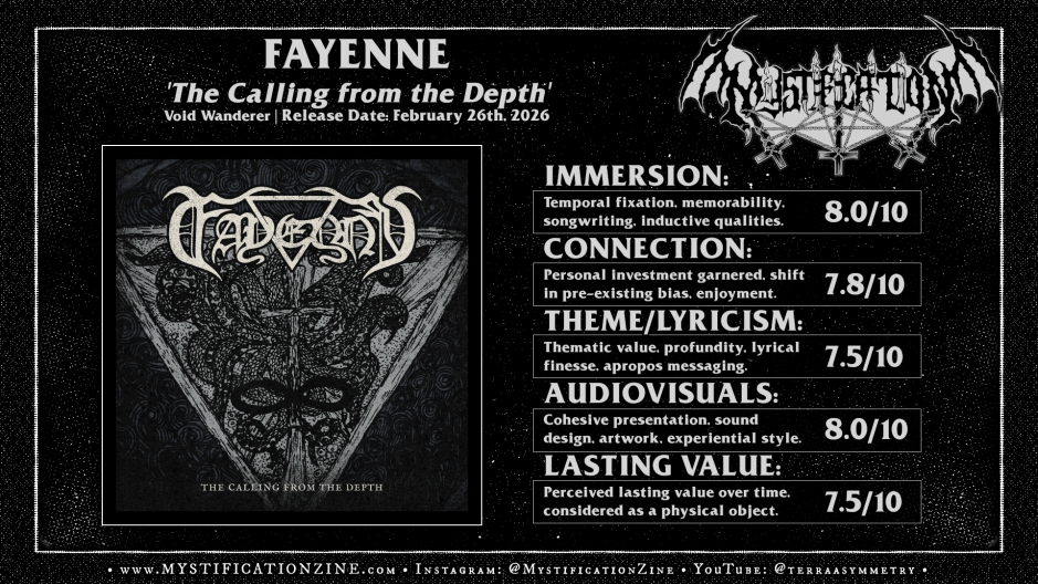 Although the shrieking quality of Hillgren‘s vocal occasionally lacks the variety of expression these songs call for and their bass guitar tone is a bit plain for my own taste Fayenne‘s debut nonetheless sports a great deal of personality within increasingly honed work. A great deal of my admiration for the trio’s craft admittedly centers around the tradition(s) that’ve inspired ‘The Calling from the Depth‘ and its guitar-driven sound yet the result is infectious if not challenging, a sinister and cerebrally writ black metal album which is recognizable in stature but not so typical. A moderately high recommendation.