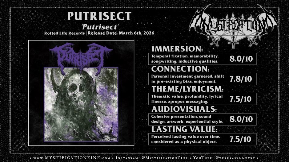 Upon returning for a third pass nearly a decade beyond the last Baltimore, Maryland-based death metal quintet PUTRISECT appear to have redefined themselves once more but perhaps definitively on this fairly substantial self-titled EP. Entirely recognizable as a modern take on ‘old school’ death metal tropes in moderate diffusion ‘Putrisect‘ is sure to catch the ear of the classicist outright with its sound and then merely satiate when it comes to aligning themselves with a certain standard of riffcraft. By aiming for a well-rounded, steadfast and groove heavy approach to pure death metal their work appears solid in stature throughout but may potentially lack in ambition for all but the dedicated traditionalist.