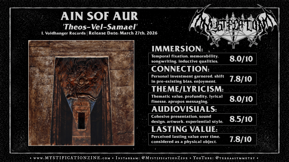 There is yet more depth to explore via the prose of Ain Sof Aur‘s exquisite lyrics, the immense detail of the Dávid Glomba illustrated cover art and deeper points of the tempo map overall but you’ve gotten the idea that their work here is both deeply spiritual in its activation as well as ambitiously atmospheric in its generation. Though the full listen should prove demanding (or, most rewarding) for the active listener intending to diffuse into ambitiously stated work ‘Theos-Vel-Samael‘ may just as well impress folks seeking a borderless vision applied to atmospheric black/death metal fusion. In either case I’d recommend it most heartily to those who’ve both patience for developing the bigger picture and inquisitive nature enough to find meaning in the details. A high recommendation.