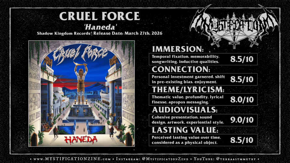 A primeval-toned adventure through unknown ancient realms of mystic savagery this fourth full-length album from Mannheim, Germany-based speed metal quartet CRUEL FORCE takes the listener back to the iron-aged mindset and methodology once more, adhering to the highest standard in the process. Unaffected by the nuclear haze of the new-what-now ‘Haneda‘ is pure mid-80’s speed/thrash metal in spirit, sound and vision a feat which serves to deeper forge and legitimize their reborn identity. You won’t find a more authentic and righteously incensed speed metal record in 2026 thus far.