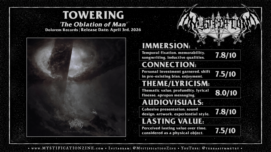 Though the lack of perceived variety available to ‘The Oblation of Man‘ harms some of its repeatable qualities from my perspective its steadfast focus and voluminous expanse creates generous immersive value per folks prone to lock in. What makes Towering stand out beyond their curation might otherwise take some digging, though I figure the detail oriented dissodeath listener with a taste for this specific atmospheric blackened death sound should appreciate the intensity and craft set behind the full listen. A moderately high recommendation.