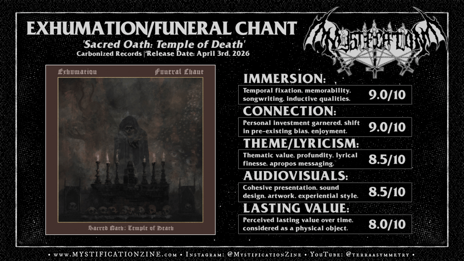 Compatriots per their enduring meditations upon death and the unlimited dark beyond now stand arm-to-arm in avowal as Indonesian duo EXHUMATION and Oaklanders FUNERAL CHANT coalesce for an inspired split album showcase. A display of ruthless esotericism and smoldering blackened death aggression ‘Sacred Oath: Temple of Death‘ captures each band at their own respective points of self-expansion, arriving upon fresh plateaus of exploratory idealism which yield darker-than-thou results beyond the norm and away from trend-hopping modernisms. Beyond a well-paired showing and strongly curated/designed gig the material here is equally praiseworthy as each band here delivers work which is evolutionarily representative rather than interstitial.