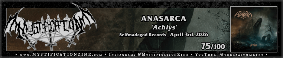 Emden, Germany-based death metal quartet ANASARCA are probably best known for their Repulse-released debut ‘Godmachine‘ back in the late 90’s where their approach was timely in that it reflected broader interest in brutality, some technical ideas and even some of the dual-rhythmic churn of early melodic death… the kind of change you’d find in next-gen (at the time) bands like Vomitory who still had a foot, or, an ear in the original movement. ‘Achlys‘ upholds a similar ideal which is fundamentally classic death metal inspired but unwilling to walk back any gained technical standards along the way. As a result there is a satisfying pure death metal affect to their work here, often veering into measured brutality while relying heavily on blitzing through tremolo-picked riffcraft. Songs like “Broken” help to accentuate the higher standards of the band as they stick in mind via catchier and/or impressive grooves. While I think this one’ll appear generic to the quick-moving passerby I’d been impressed with a number of these songs for the variety of song types expressed along the way. By my ear “How Can They”, “My Reality” and the pairing of “He Is Dead” and “Broken” stood out most.
