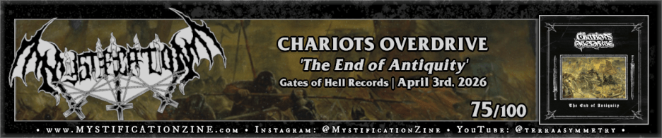 Approximating the early 80’s Priest inspired sect of the NWOBHM and early USPM with a largely anthemic debut Atlanta, Georgia-based quartet CHARIOTS OVERDRIVE manage a few catchier sing-alongs on the way through ‘The End of Antiquity‘. The standard mid-paced strut through several of these songs begins to define their signature but fairly rough, often tuneless vocals detract as strained performances offer grating epic heavy metal busking rather than empowering melody. The real boon(s) to this record come with closer attention paid to both to fleet-handed guitar work and the “walk” of the bass guitar performances (see: “Marching Maniacs”) throughout, which shape each piece into gesture and reduce the flatness of their impact. The full listen is somewhat inconsistent in tone but the more detail punched into the song (re: “A Taikonautic Alchemist”, “A Bizarre Pilgrimage to the Cubik Mansion”, etc.) the more prone I was to return for another listen.