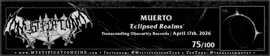 Querétaro, Mexico-based trio MUERTO present a chasmic and somewhat minimalist expanse here on their third full-length album which is yet again rooted in their own ideation of menacing atmospheric black metal given to fits of doomed stature. Because this work features folks from Darkside Ritual and Necronos you can expect a dark underground gloom hangs overhead at all times per both performances and production values. Much of ‘Eclipsed Realms‘ follows a similar formula which blends a sort of avant-black shudder of dissonance with downward echoing rasps commanding the way forward, utilizing similar cadence and patternation for the lot. There are a few clear standouts on the way through with “Burning Shadows” and “Serpentine Echoes” carrying a lot of the weight early on before cleaner vocals and some post-metallic movement find their way into the final two pieces. The obscure atmosphere and venomous vocal performances were intriguing enough here overall but I’d found myself losing interest once I’d hit the second half of the album.
