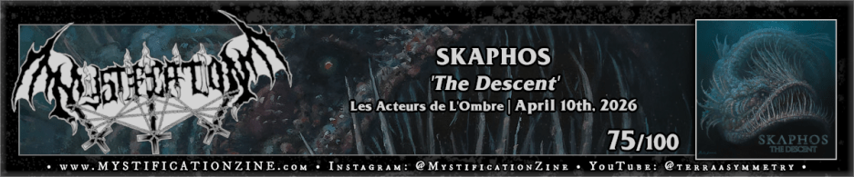 Lyon, France-based blackened death metal quartet SKAPHOS have retconned a sort of “best of” from their lesser-known first two albums (‘Bathyscaphe‘, 2020 + ‘Thooï‘, 2022) as they’ve rearranged/rewritten and re-recorded them for ‘The Descent‘. Though I’m not sure what the purpose of such immediate revision is I’d assume these are pieces which are either deemed impressive enough to redo or simply important to the artist. The realm of semi-dissonant blackened death achieved at a Behemoth level of loudness is most definitely crowded anymore but the Lovecraftian themes and such should have you thinking of earlier Sulphur Aeon to some degree as these songs realize. Since they are pulling from slightly more brutal origin than the material on ‘Cult of Uzura‘ (2025) you’ll find a strong mix of chasmic atmospheric large-scale gesturing (“Horror Squid”, “Okean”) set beside groovier, harder-chugged death metal pieces (“The Descent”, “Mireborn”) all of which make sense in succession. Though I find their work quality across the board there were few moments that had me returning for a closer listen.