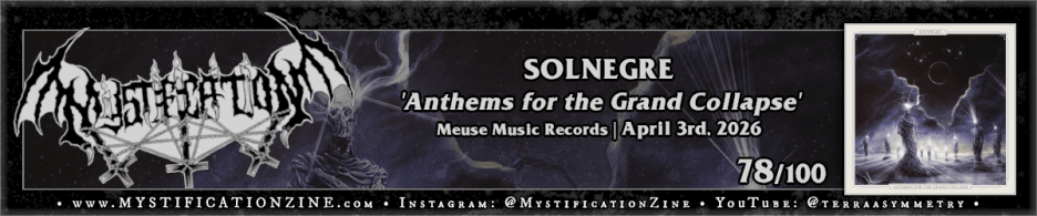Balearic Islands, Spain-borne melodic death/doom metal quartet SOLNEGRE have been around since 2022 when two founding members left their long standing positions in Helevorn and struck out on their own current. ‘Anthems for the Grand Collapse‘ is the second full-length album from the band as they continue to reinforce early 90’s melodic doom inspired constructs in dramatic, emotional conveyance. Taking a page from dark metal for melodic guitar work alongside some spaced-out funereal ambiance atop they’ve developed a sincere enough result here which divulges trials, tribulations and various other breaks of the psyche as cathartic offerings. While I find a lot of music along these lines too sweetly romantic to convey any real flesh-churning dread these songs bear intense enough momentum to convince of their dramatism. While the opener carries some melodic death influence I would say “For All That Could Have Been” explores modern ideas from the sub-genre most directly and these are likely to be hot spots for most listeners. Not entirely my thing but I appreciate the emotionally driven intent of their work.