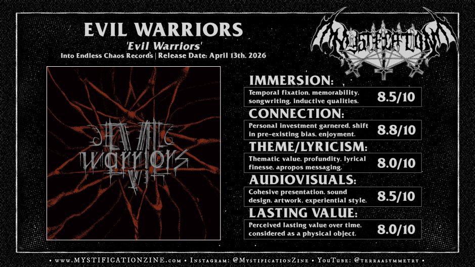 Through minds possessed by unrelenting visions of death a third and darkest wave of mania manifests within the cultic summon of Leipzig, Germany-based black metal quartet EVIL WARRIORS wherein obsessive, droning diabolic spellcraft is unleashed upon the unwitting ear. Fallen toward increasingly bleak atmospheric regimen this third full-length album, ‘Evil Warriors‘, finds the band unbound yet steadfast in their creation as hypnotic and disruptive currents fuse into melancholic boil. Though it doesn’t offer an extreme reaction to their previous album, avoiding any danger of becoming labelled “progressive” in the process, elements of psychedelia and avant-garde voicing bring new interest to their shifting sands.