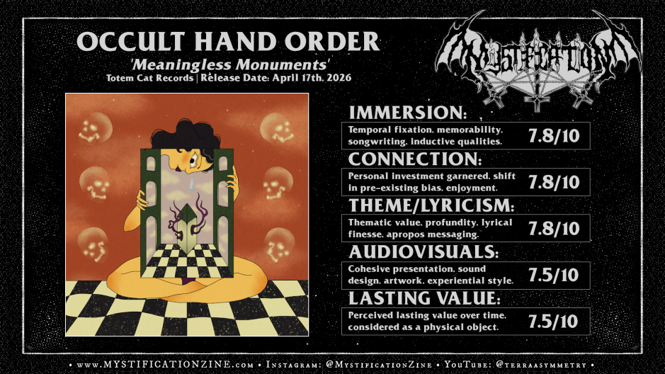 Folks seeking a heavier, riff-driven stoner/doom metal record or a demented post-metal experience won’t likely be sated by the heady introspection Occult Hand Order have to offer on ‘Meaningless Monuments‘ but that does not detract from their wielding of those points of inspiration in forging their own melodramatic voice. Where they place highest impact and how they’ve structured these pieces into frame is effectively cinematic, a natural station for a band so heavily dosed with moderne sense for psychedelic metal variations, which lends a unique enough voice to a familiar dynamic. The balance between sublimely chilled surrealism and emotional expression is exceptional here and this is the major success of the band’s work but there’ll be plenty enough heavy, noisome arcs cut through for the adventurous doom-seeker to be flattened by. A moderately high recommendation.